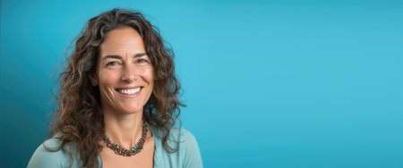 smiling middle-aged woman with long hair looking at camera on turquoise background, banner, space for text