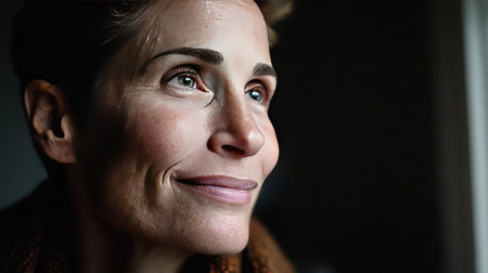A thoughtful woman gazes out of a window, her serene expression illuminated by soft light. This intimate portrait captures beauty, reflection, and tranquility.