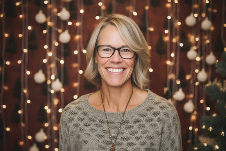 Portrait of smiling woman with eyeglasses against christmas lights