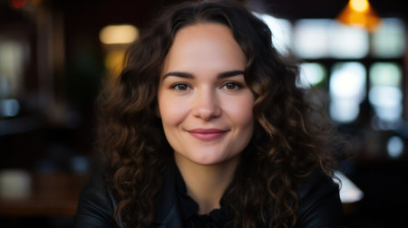 Beautiful woman with curly hair and a bright smile, captured in a candid moment, natural light accentuating her features and joyful spirit
