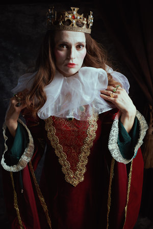 scary medieval queen in red dress with white collar and crown on dark gray background.
