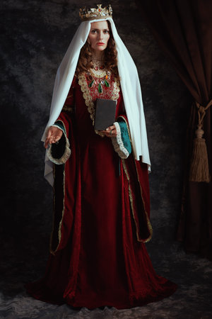 Full length portrait of medieval queen in red dress with book, veil and crown on dark gray background.
