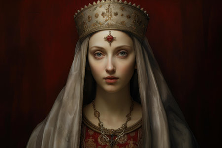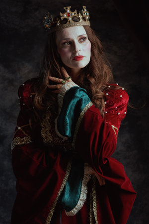 pensive medieval queen in red dress with white collar and crown on dark gray background.