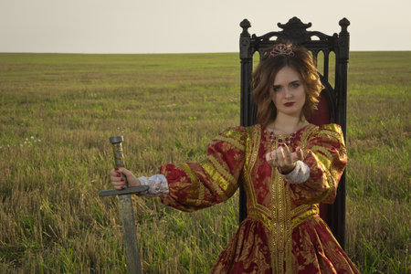 Queen in vintage dress in summer field