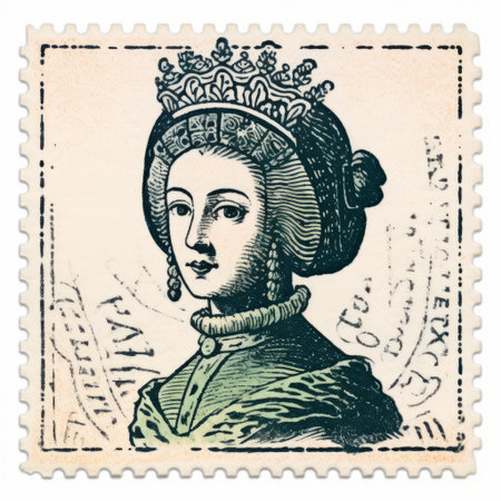 medieval queen in red dress with white collar and crown on dark gray background.