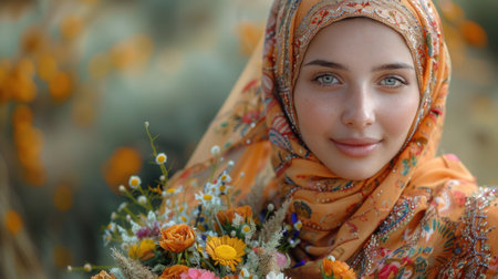 A joyful Muslim woman, holding a bouquet of flowers, celebrating a special occasion.