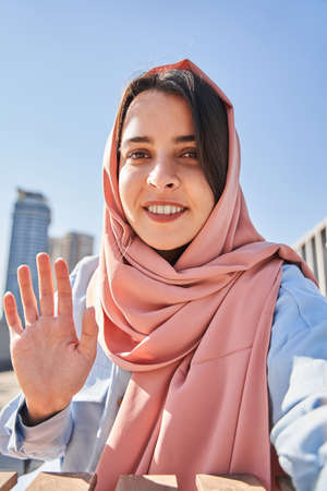 Close up of a smiling young muslim woman in hijab standing on a street looking at camera