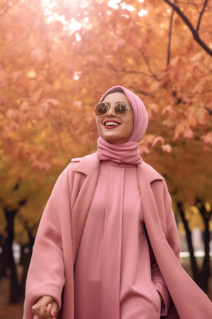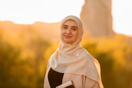 Muslim woman wearing hijab walking in the park at sunset, lifestyle portrait