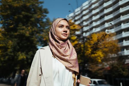 Beautiful young muslim woman standing in the street wearing hijab and looking at camera.