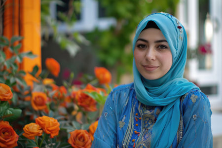 A woman wearing a blue scarf and a blue dress is sitting in front of a flower garden. The flowers are orange and the woman is smiling