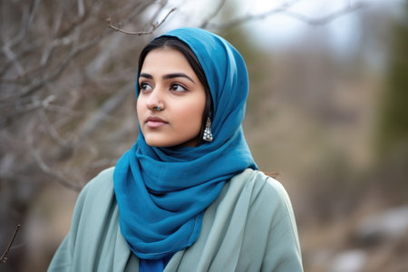 An unspoiled, youthful Muslim woman in a headscarf takes pleasure in the earth's natural resources, akin to heaven on earth.