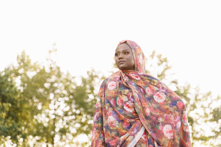 Muslim black woman African ethnicity weared traditional colorful hijab smiles and looks left side on the green meadow. Pretty black girl smiles