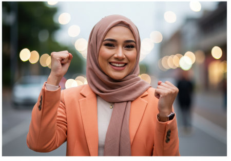 A smiling woman wearing a hijab and a blazer is celebrating with raised fists in an urban environment. The image conveys a sense of success, joy, and achievement. The woman's cheerful expression and celebratory gesture create a positive and uplifting visual narrative. The background features blurred lights, adding to the vibrant atmosphere. This image features a transparent background, making it versatile for various design projects.