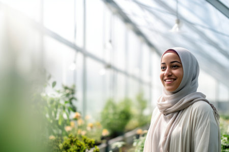 Young muslim woman wearing hijab and smiling while standing in a greenhouse