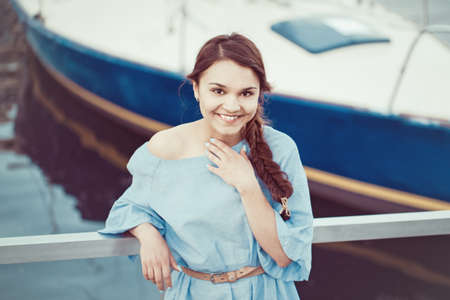 Portrait of white Caucasian brunette woman with tanned skin in blue dress by seashore lakeshore with yachts boats on background on water, lifestyle concept