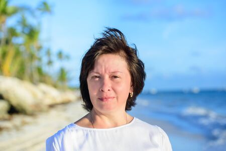 Closeup on beautiful happy female face over ocean background. Vacation travel adventure