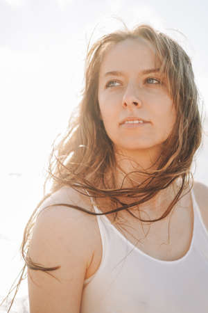 Young blonde beautiful woman with long hair in white dress enjoying life on sea beach