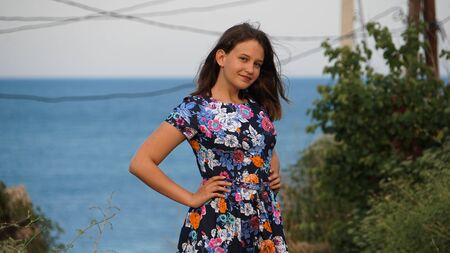 young girl in summer dress standing at tropical beach, crete, Greece, portrait