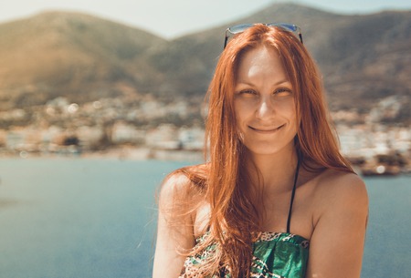 Nice girl with long red hair is standing on the background of a water surface. Portrait of a woman without retouching with her natural imperfections