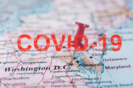 Red clerical arrow on the map of the United States, with the inscription COVID-19 southern Washington, DC and the capital of Richmond. Coronavirus 2019-outbreak, 2020 pandemic.