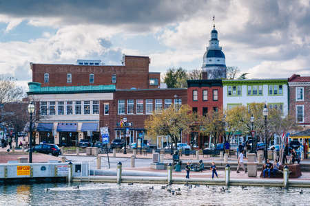 Buildings along Annapolis Harbor and the Maryland State House in Annapolis, Maryland.