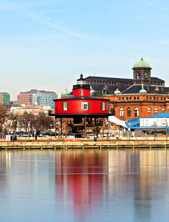 The Seven Foot Knoll Lighthouse in Baltimore Inner Harbor The lighthouse reflection during sunset