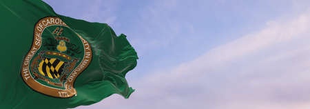 flag of county Caroline, Maryland , USA at cloudy sky background on sunset, panoramic view, Patriotic concept about Caroline, Maryland and copy space for wide banner. 3d illustration