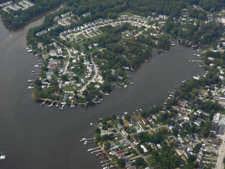 Baltimore, Maryland- September 2017: Scenic aerial view of the Curtis Creek snaking around docks.
