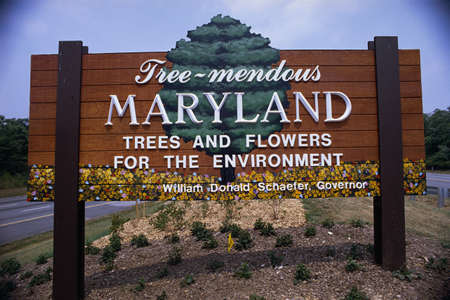 This is a road sign that says Tree-mendous Maryland, trees and flowers for the environment. It is the welcome to Maryland sign.