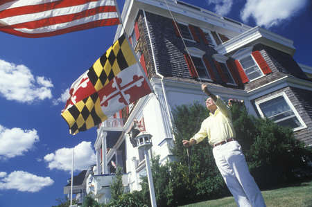 Man Raising American and Maryland Flags, Cape May, New Jersey