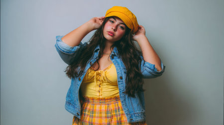 A plus size girl stands in a stylish outfit, showing her confidence in a studio setting with soft, neutral tones.