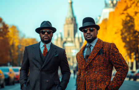 A Stylish African American men in fashionable suits walking on street, showcasing elegance and confidence amidst vibrant autumn backdrop