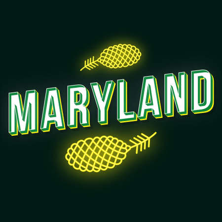 Writing with the name of the US state Maryland made of dark metal in front of state flag