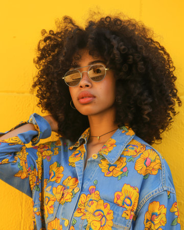 Fashion model wearing a colorful traditional Ghanaian dress and sunglasses, posing against a vibrant yellow wall