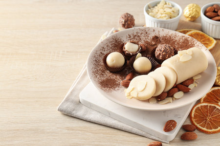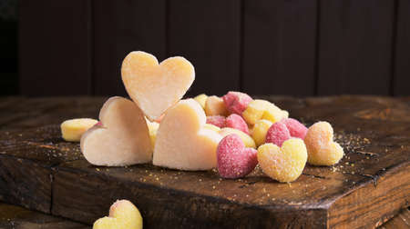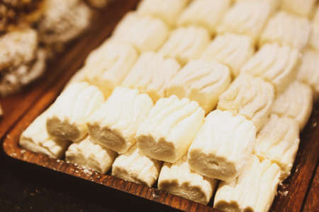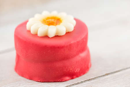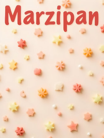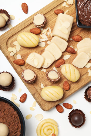 Variety of handmade Marzipan on wooden background. Selective focus.