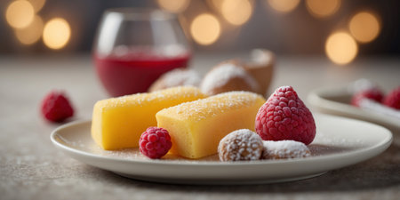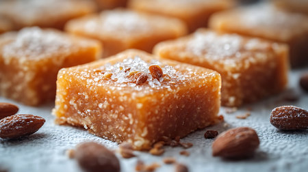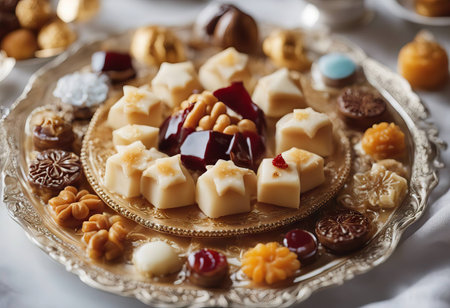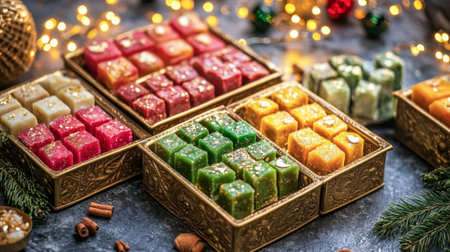 Colorful Indian mithai arranged in elegant festive decor with twinkling lights. concept of celebration, indian sweets, and festive tradition.