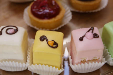 Iced mini cakes named Petit four glace. Delicious for a high tea or as dessert.