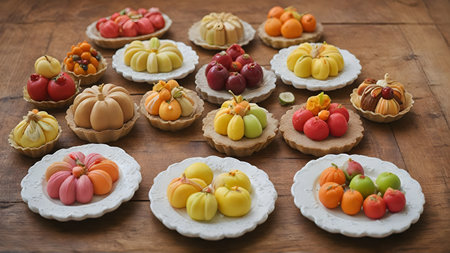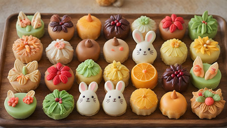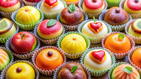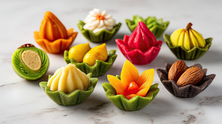 This stunning assortment of colorful Asian desserts showcases a variety of intricate, flower-shaped sweets and vibrant fruit designs, perfect for food photography.