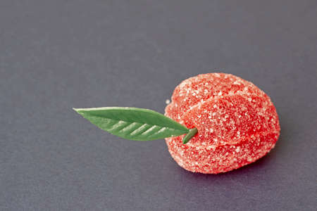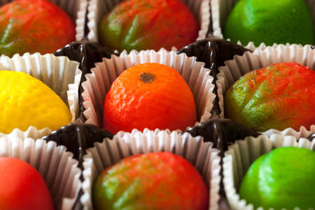 Fruit shaped candies in macro image of marzipan sweets in paper wrappings