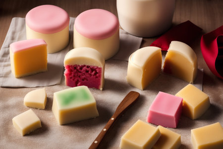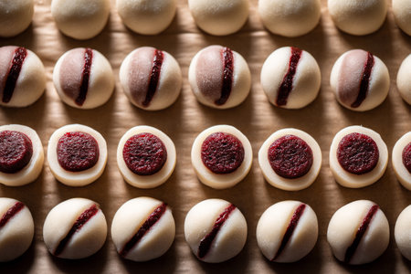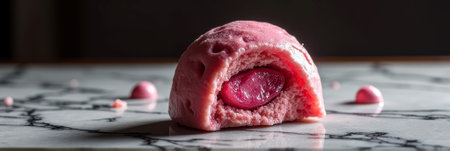 Pink mochi with red bean filling on marble surface. That the image is generated using AI.