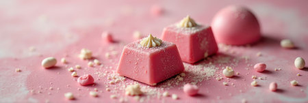 Pink chocolate truffles on textured surface with decorative crumbs and spheres. That the image is generated using AI.