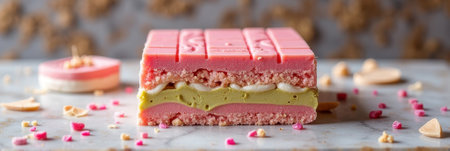 Colorful layered pastry with pink and green icing on marble surface. That the image is generated using AI.
