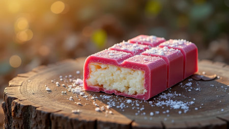 Delicious raspberry coconut chocolate on wooden surface with sunlight. That the image is generated using AI.