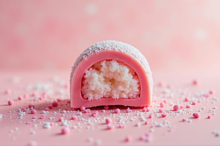 Pink dessert with coconut filling and sprinkles on soft background. That the image is generated using AI.