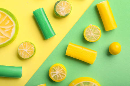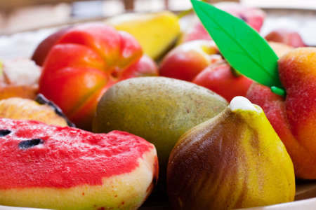 Colorful marzipan sweets with fruits shapes made of almond and suga