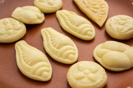 Flat lay of a tray of typical marzipan from San Dionisio in Valencia on October 9 of each year. Gift for lovers. Mocadorà de Sant DonÃs