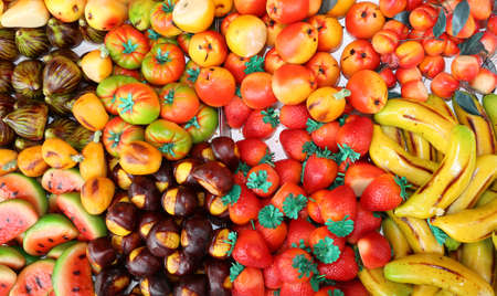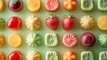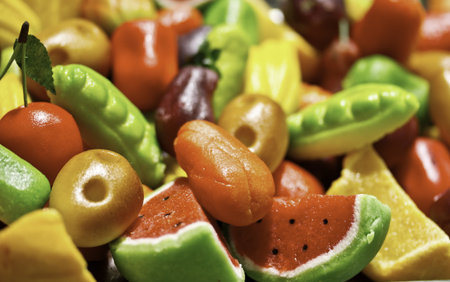 A vibrant assortment of miniature candies resembling fruit and vegetables, perfect for artistic displays, party decorations, or sweet treats.