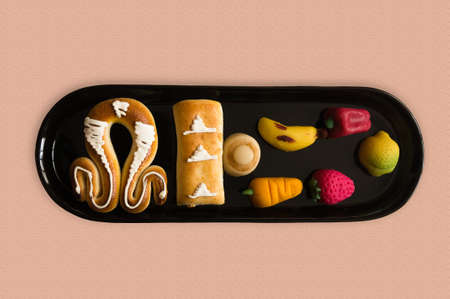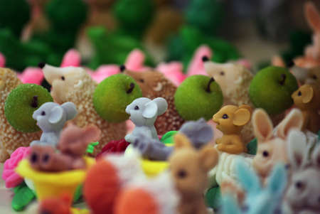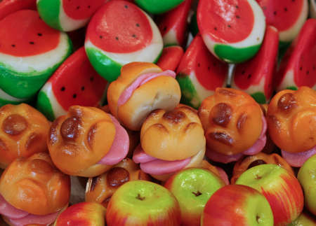 shaped cakes with marzipan and sugar of things to eat for sale to the market