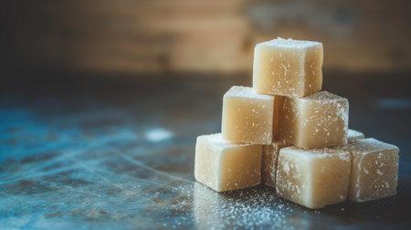 Stacked cubes of sugar on a metal surface, showing simplicity and sweetness in a minimalist style.