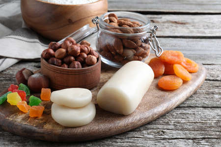 Whole food, good for health. Marzipan paste sliced blanched almonds and seeds on wooden kitchen board background